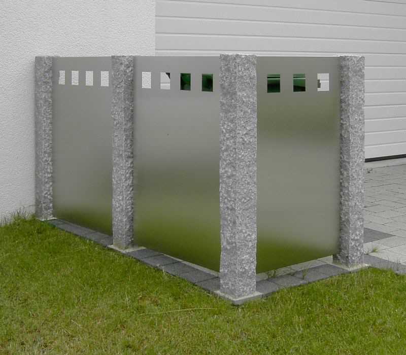 Die Mülltonnenbox Freiburg besteht aus gestanzten Edelstahlblechen, die zwischen Granitpfosten, Stahlpfosten oder Holzpfosten verschraubt werden und so eine stabile, moderne und optisch hochwertige Konstruktion bilden. Die Kombination aus massivem Trägermaterial und fein perforierten Edelstahlflächen sorgt für eine elegante Linienführung, eine gute Belüftung der Mülltonnen und verhindert gleichzeitig Geruchsbildung. Die Türen lassen sich leicht öffnen und werden durch Federschnäpper sicher geschlossen gehalten. Die abgebildete Ausführung bietet Platz für zwei 120‑Liter‑Mülltonnen; Varianten für Papiertonnen sind entsprechend größer. Die Mülltonnenbox Freiburg ist als Einzelbox, Doppelbox oder Dreifachbox sowie als Reihenanlage für 120‑ und 240‑Liter‑Behälter erhältlich. Sondergrößen und individuelle Anpassungen sind ebenfalls möglich.